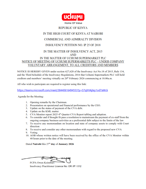 Notice Of Meeting of Uchumi Supermarkets Plc – Under Company Voluntary Arrangement, To All Creditors and Members